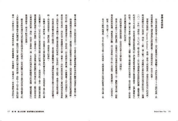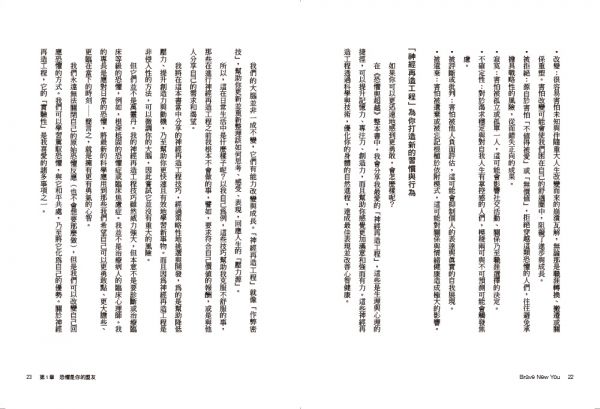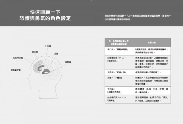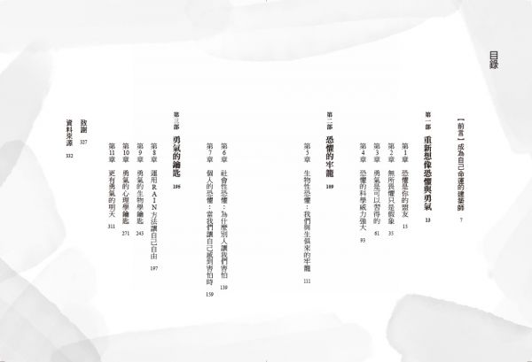 書中分爲三個部分,在第一部中,作者透過最新神經生物學與心理學研究,向我們展示了恐懼與勇氣的科學;在第二部中,揭示了社會在恐懼體驗中所扮演的角色;最終第三部,提出了各種工具與方法,幫助讀者開始追求新的人生,不再受制於憂慮擔心。