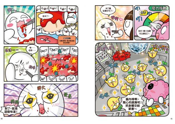 「漫畫中腦控制室、膀胱、胃、舌頭、消化器官、血液等都以生活事件為背景,超搞笑!尤其是吃辣篇,體溫上升還嗶嗶聲…笑到翻頁都停不下來」——讀者 S**a