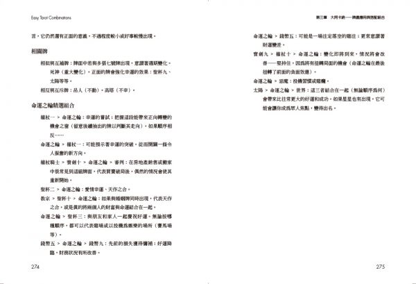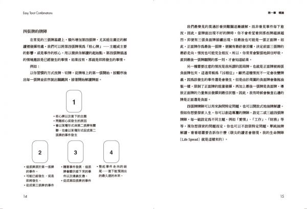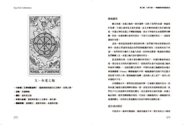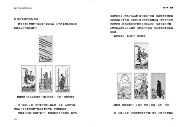 塔羅組合的前後順序極為重要。每一張牌所象徵的事件,都會與下一張牌的情境形成因果關聯。從最簡單的兩張牌、三張牌、四張牌,到五張牌以上的複雜組合,都能在本書的引導下,讓思路更清晰開闊,見樹又見林。