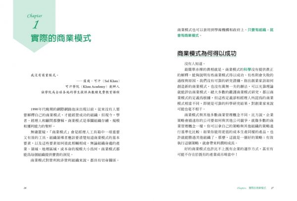 商業模式是以地圖或故事呈現的設計,這些要素集中圍繞在資源、交易、價值創造,當這些要素達成協調、彼此相互配合,便能產生前後一致且說服力十足的敘事,而商業模式就有可能持續進行: