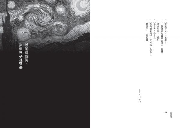 但我也試著這麼想,這是加進了時間的星辰模樣對吧。時間在子夜流逝,時間在珍視的事物遠離我們時流逝,時間在星辰之間流逝,每一顆星原來所在及其亮光已熄滅了,但站得夠久的畫家記得它,記住了它,或者說,此一光暉連續的進入了、留在了他眼睛裡。