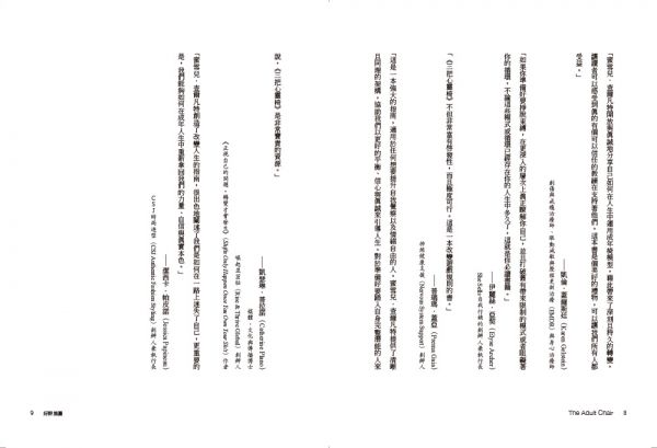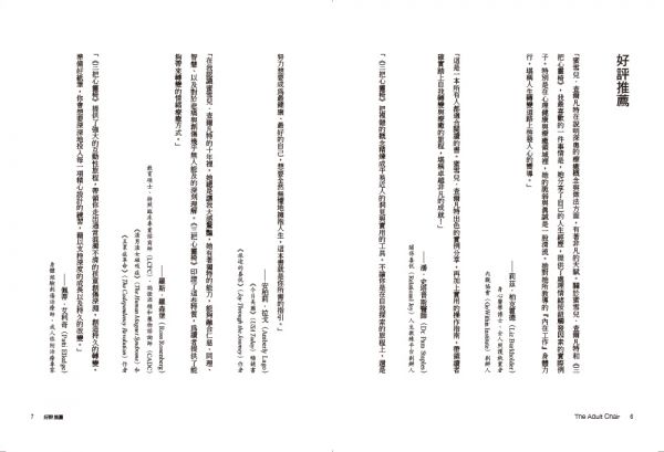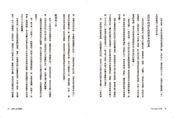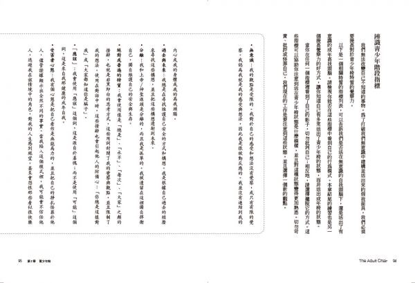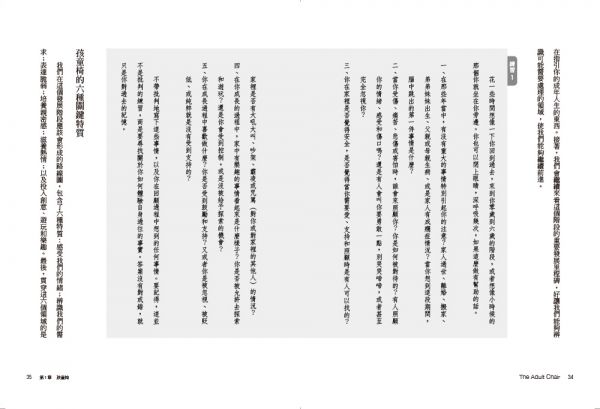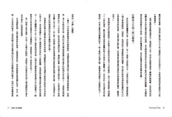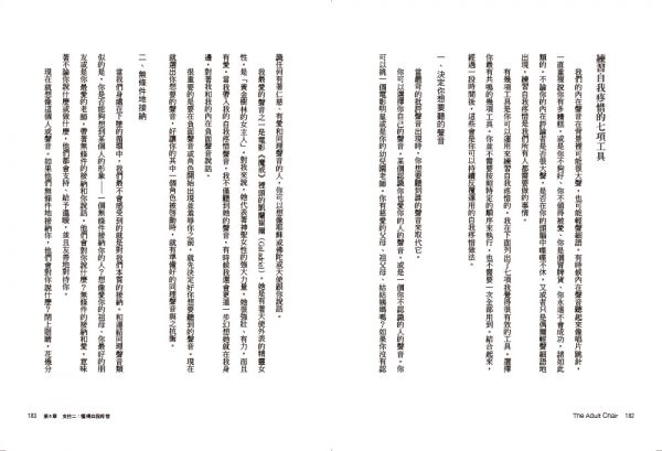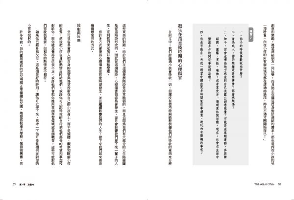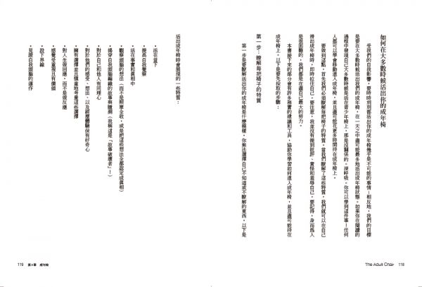本書分為兩部分,第一部,先詳細說明三把椅子的發展階段,一步步揭露我們無意識中選定的人生劇本;第二部,透過五大支柱開始學習成為健康的大人,經由每天持續的練習,翻轉內在諸多老舊的破壞性信念。