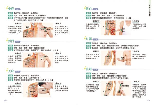 一側11個穴位,左右共22個穴位,分布於手部和前胸上部。首穴中府,末穴少商。