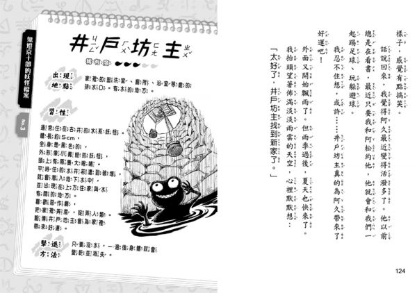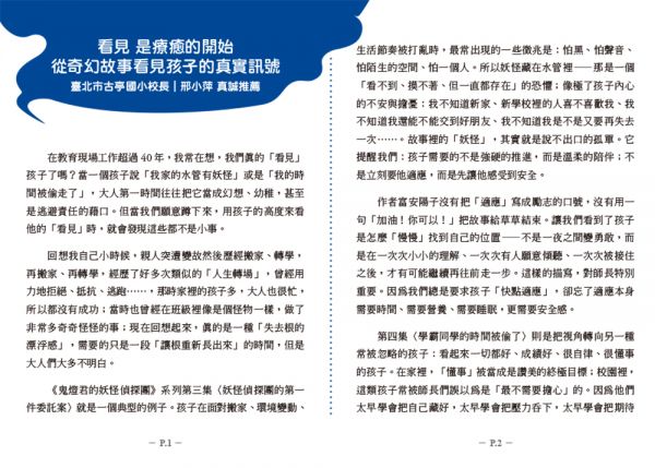 書裡有好多奇妙的妖怪,情節也很精彩,一下子就讀完了……這本書真的很好看,會一直看下去很想知道接下來的劇情走向,推薦給喜歡妖怪故事的小朋友們!——小學低年級,吳〇霖