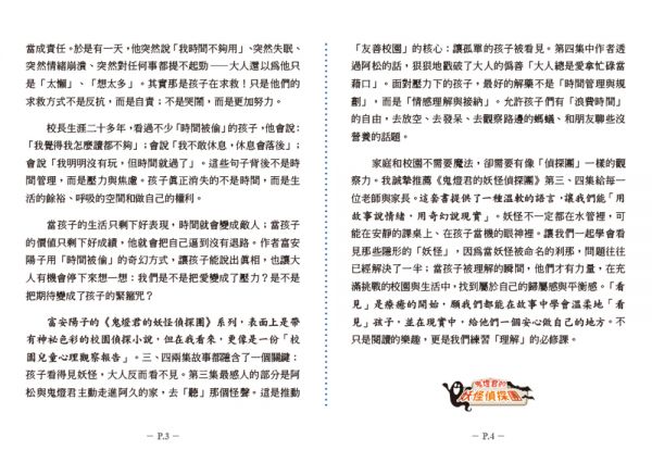 注音版的長篇書籍對孩子非常「體貼入微」,從校園的主題帶入妖怪、友情、冒險犯難的主題讓孩子更快融入情境。故事中也出現大量的成語置入,邊期待劇情邊學習用法,馬上就可學以致用,更能現學現賣。特別用加粗字體強調主角跟內心的自己對話,字句的動作跟聲音呈現彷彿瞬間置身其中,讓讀者變成了主角「真」先。——小四生家長